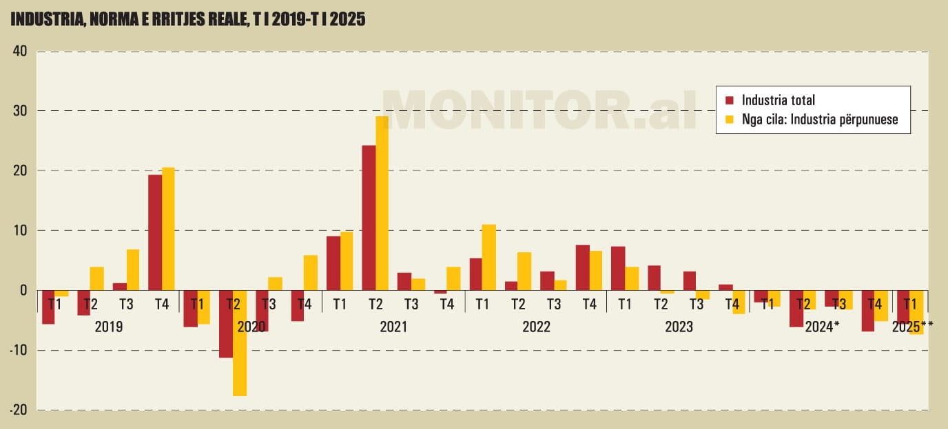 Të dhënat e INSTAT bënë të ditur se industria në total (“Industria nxjerrëse; përpunuese; energjia elektrike, gazi, avulli dhe furnizimi me ajër të kondicionuar; furnizimi me ujë; aktivitetet e trajtimit dhe menaxhimit të mbeturinave, rehabilitimit”) pësoi rënie me 4.55% në vitin 2024, hera e parë me ecuri negative që nga periudha e pandemisë, kur tkurrja ishte 7.32%.