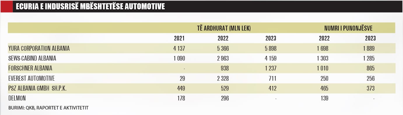 Kompanitë aktive që u përkasin industrisë automotive në vend janë “Forschner Albania”, “Delmon Group Albania”, “PSZ Albania”, “Yura Corporation” dhe “SEWS Cabind Albania”, ku secila prodhon për kompani të huaja, duke përshtatur ritmin me kërkesën që përditësohet herë pas here.