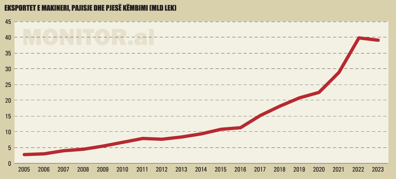 Për herë të parë që nga 2016, kur filluan rritjen e vrullshme, eksportet e makinerive, pajisjeve dhe pjesëve të këmbimit shënuan tendencë rënëse, ndonëse të lehtë. Shitjet e këtij grupi ishin rreth 39 miliardë lekë, me tkurrje prej 1.5% me bazë vjetore.