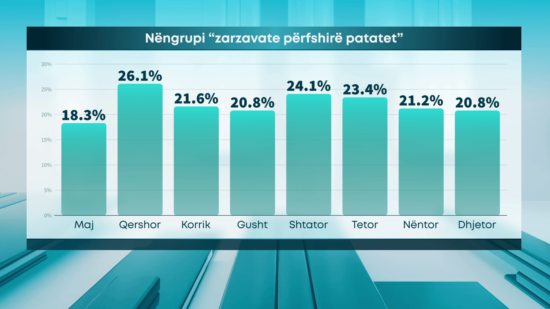 Të dhënat e INSTAT tregojnë se nëngrupi “zarzavate përfshirë patatet”, ka pësuar rritjen më të madhe në 8 muajt e tjerë të vitit 2023. Më konkretisht, ky nëngrupim në muajin maj ka shënuar një rritje prej 18.3%, ndërsa në muajin qershor ka rritjen më të madhe duke arritur në 26.1%. Për të vijuar me 21.6% në korrik ndërsa gushtin ka arritur në 20.8%.
