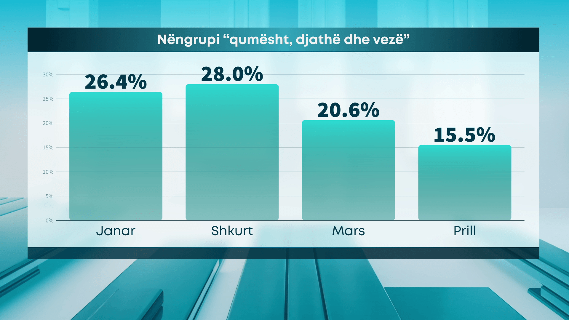 Në 4 muajt e parë të 2023, brenda grupit të ushqimeve dhe pijeve joalkoolike, çmimet e nëngrupit “qumësht, djathë dhe vezë” ka një rritje të ndjeshme duke filluar me 26.4% në janar, 28% në shkurt si dhe 20.6% në mars dhe 15.5% në prill.
