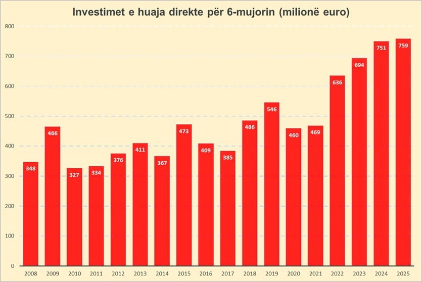 Për të gjithë 6-mujorin e parë, vlera e përgjithshme e investimeve të huaja direkte arriti në 759 milionë euro, me një rritje të vogël prej 1% (rreth 8 milionë euro) krahasuar me të njëjtën periudhë të vitit të kaluar.
