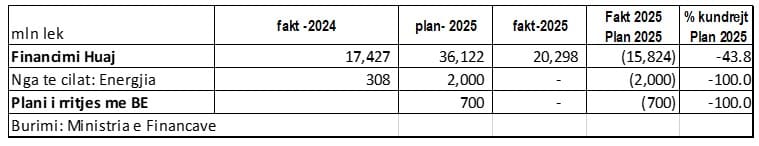 Sektori i energjisë paraqet situatën më drastike brenda zërit të investimeve nga fondet e huaja. Nga një plan ambicioz prej 2 miliardë lekësh nga financimi i huaj, nuk u alokua asnjë cent në vitin 2025.