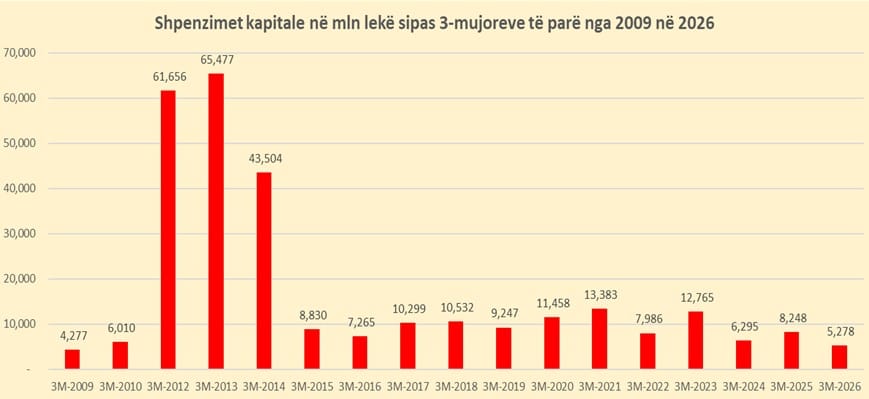 Grafiku i shpenzimeve kapitale për tremujorët e parë tregon një epokë të artë të investimeve rreth viteve 2012-2013, ku shifrat kapërcyen 65 miliardë lekë, për të pasuar më pas me një rënie drastike që nuk u rikuperua kurrë.