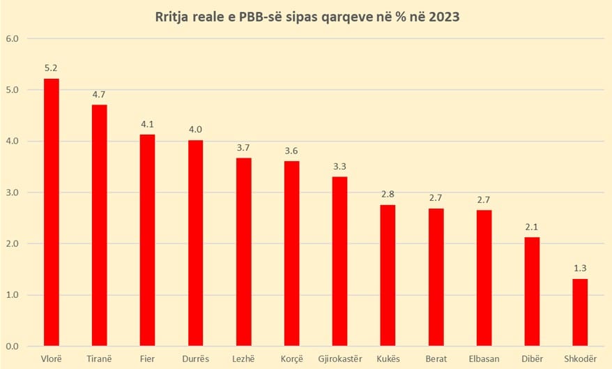Të dhënat zyrtare të INSTAT për vitin 2023 tregojnë se Qarku i Vlorës kishte rritjen më të fortë të PBB-së, me 5.2% në krahasim me vitin 2022, duke kryesuar ndaj 11 qarqeve të tjera. Në të kundërt, Qarku i Shkodrës kishte rritjen më të dobët, vetëm 1.3%, ose rreth një të katërtën e rritjes prej 4% në rang kombëtar.