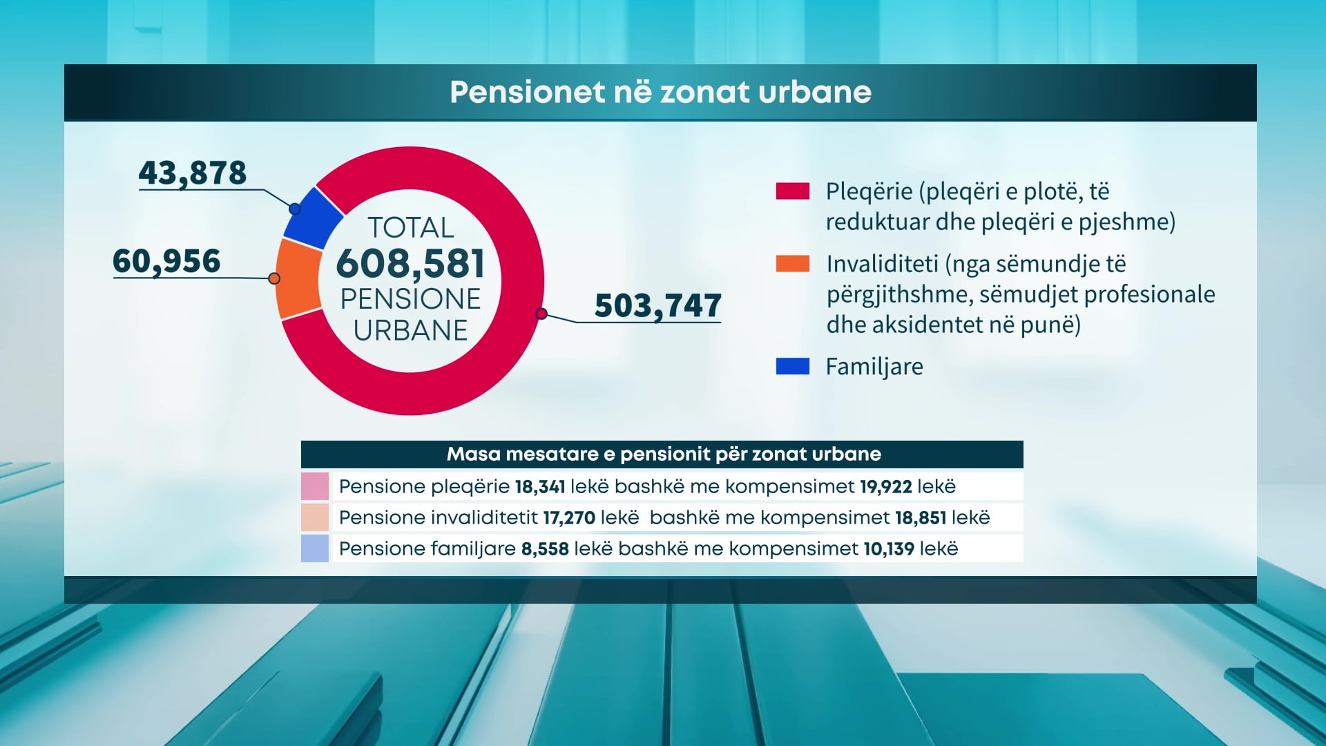 Në mënyrë të detajuar, nga 608 581 pensione urbane: 503 747 janë pensione pleqërie duke përfshirë këtu pleqëri të plotë, të reduktuar dhe të pjesshme. Për këtë kategori masa e pensionit shkon mesatarisht 18 341 lekë dhe bashkë me kompensimet që aplikohen, arrin në 19 922 lekë në muaj.