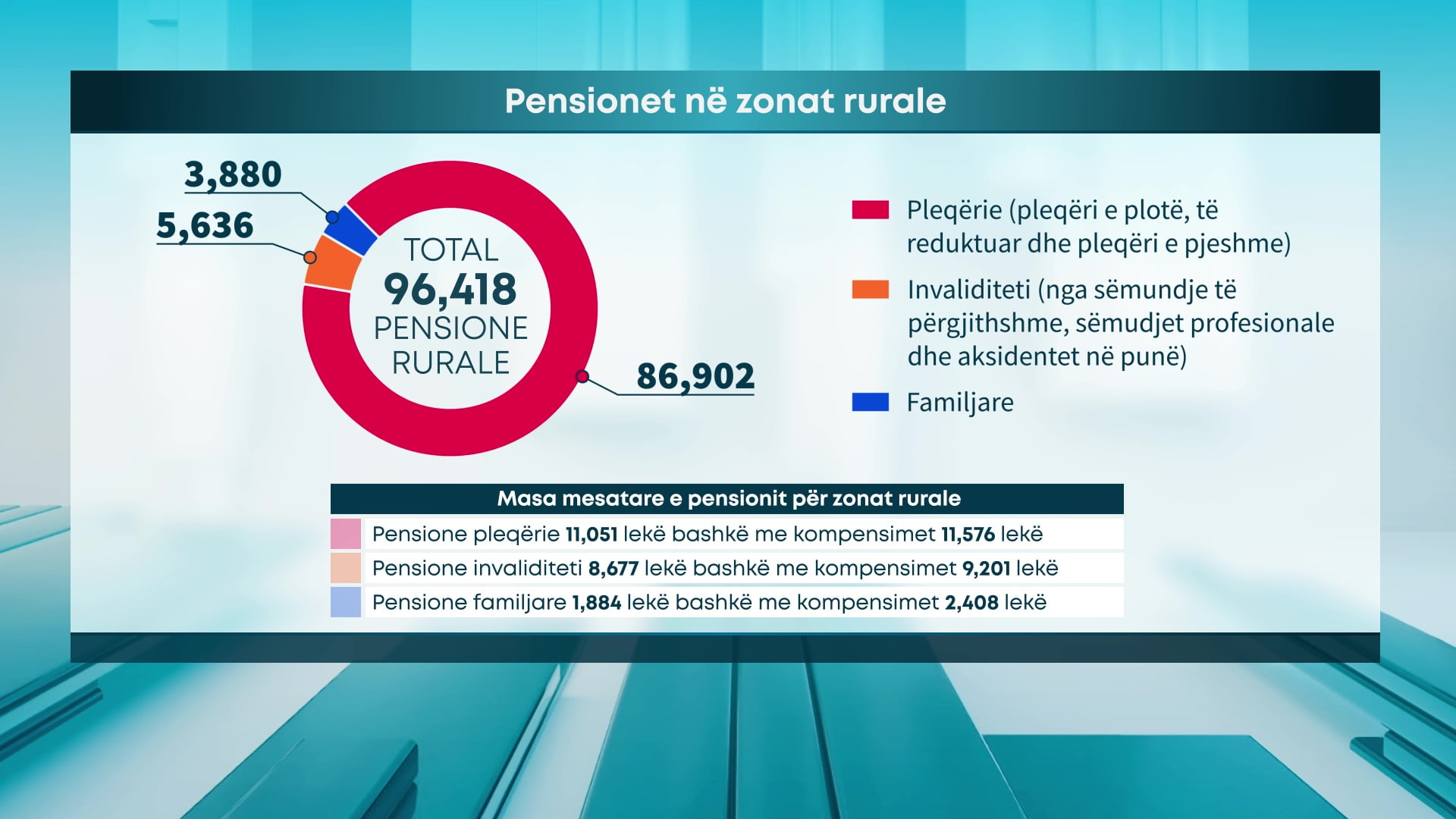 Kategoria tjetër që preket në tërësinë e saj janë pensionet në zonat rurale. Janë 96 418 persona në skemë, nga të cilët 86 902 trajtohen me pensione pleqërie (pleqëri e plotë dhe e pjesshme), 5 636 me pensione invaliditeti dhe 3 880 me pensione familjare.