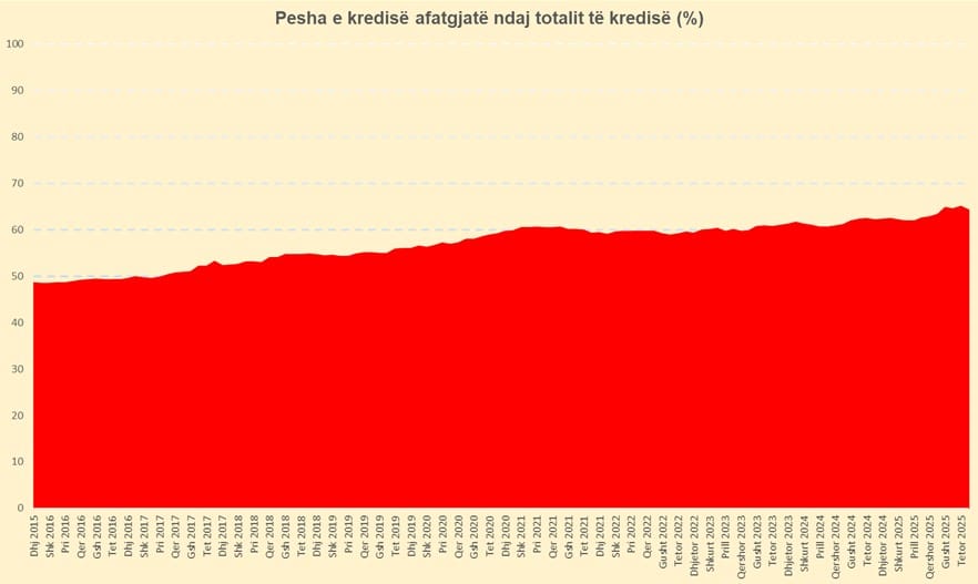 Pesha e kredisë afatgjatë ndodhet pranë niveleve më të larta historike. Ky nivel u regjistrua në tetor 2025, kur kredia afatgjatë përbënte më shumë se 65% të totalit të portofolit.