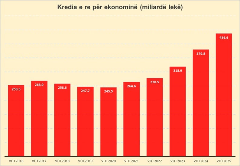 Sipas të dhënave nga Banka e Shqipërisë, vlera e kredisë së re të disbursuar arriti në 436.6 miliardë lekë, në rritje me 15% krahasuar me vitin 2024.
