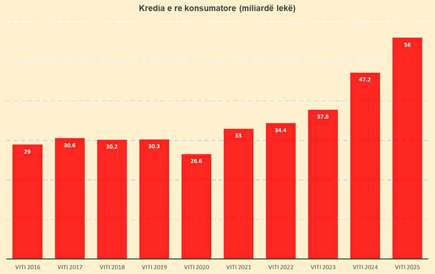 Sipas Bankës së Shqipërisë, kredia e re konsumatore e dhënë gjatë vitit të kaluar arriti në 56 miliardë lekë ose rreth 572 milionë eurove (llogaritur me kursin mesatar të 2025). Kjo shumë përfshin kreditë konsumatore me këste dhe paradhëniet bankare apo overdraftet e individëve.