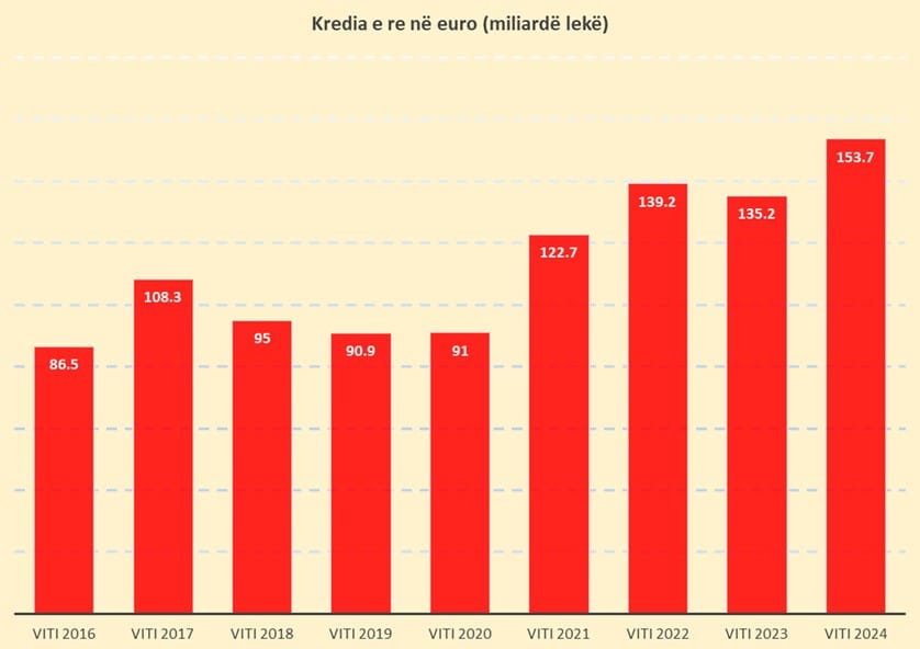 Kredia në euro u rrit me 13.7% krahasuar me vitin 2023, por shifrat nuk janë të rregulluara me efektin e kursit të këmbimit. Nëse mbajmë parasysh se kursi mesatar i këmbimit euro-lek ra me 7.4% vitin e kaluar, rritja e kredisë në euro, e pastruar nga efekti i kursit të këmbimit, do të ishte afërsisht 21%.