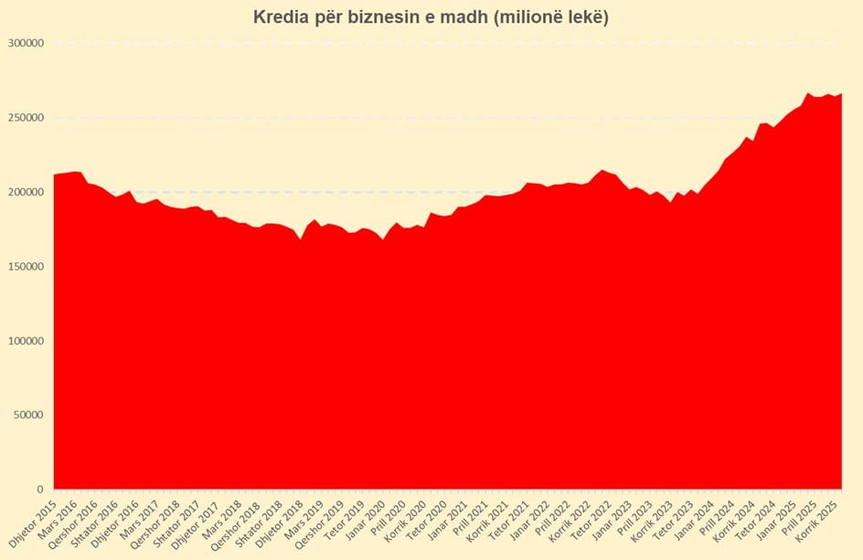 Të dhënat e detajuara tregojnë se norma më e lartë e rritjes së kredisë për biznesin e madh regjistrohet në segmentin e kredive afatgjata, që zakonisht kanë si qëllim financimin e projekteve të reja të investimit. Kredia afatgjatë në fund të gushtit rezultonte në rritje vjetore me më shumë se 16%, për një vlerë totale prej 129 miliardë lekësh.