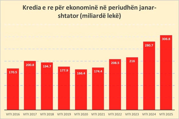 Gjithsej, për 9-mujorin e vitit 2025 sektori bankar ka dhënë gjithsej 306.8 miliardë lekë kredi për ekonominë, në rritje me 9.3% krahasuar me të njëjtën periudhë të vitit të kaluar. Kredia e re e disbursuar nga sektori bankar këtë vit është në vlerat më të larta historike, por megjithatë ritmi i rritjes është më i ngadaltë krahasuar me vitin e kaluar.