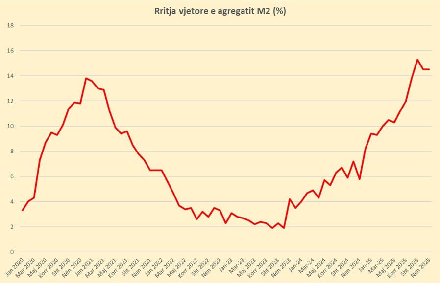 Agregati M2 është rritur me ritme dyshifrore që prej muajit mars 2025, ndërsa ka arritur nivelin maksimal prej 15.3% në shtator. Në periudhën tetor-nëntor, rritja është reduktuar lehtë në nivelin 14.5%.