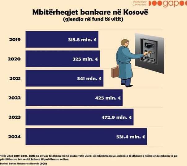 Të dhënat e publikuara nga Instituti GAP tregojnë se mbitërheqjet bankare nga ekonomitë familjare dhe bizneset në Kosovë kanë arritur një nivel rekord në vitin 2024.