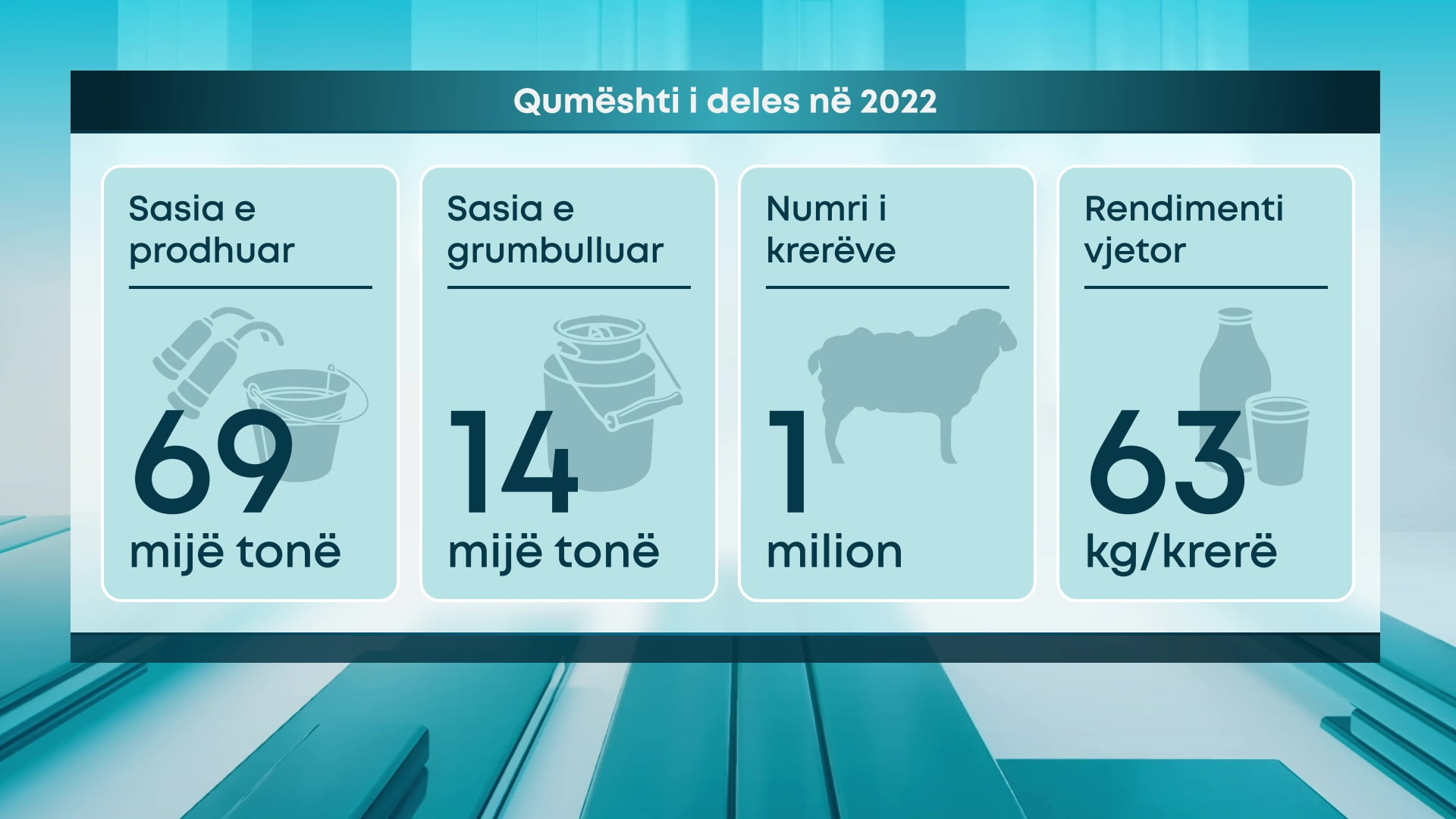 Por sa qumësht deleje prodhohet në vend? Sipas të dhënave të INSTAT në 2022 u prodhuan 69 mijë tonë, apo 6,0% më pak se në vitin 2021 për shkak edhe të rënies së numrit të krerëve. Sasia e grumbulluar e qumështit të deles, në vitin 2022, është rreth 14 mijë tonë, duke shënuar rritje me rreth 9,7%, krahasuar me vitin 2021. Shqipëria numëron 1 milionë krerë dele, qumështi dhe rendimenti mesatar vjetor në nivel vendi i qumështit të deles është 63 kg për krerë. Rendimentin më të lartë e ka qarku i Durrësit me 125 kg për krerë.
