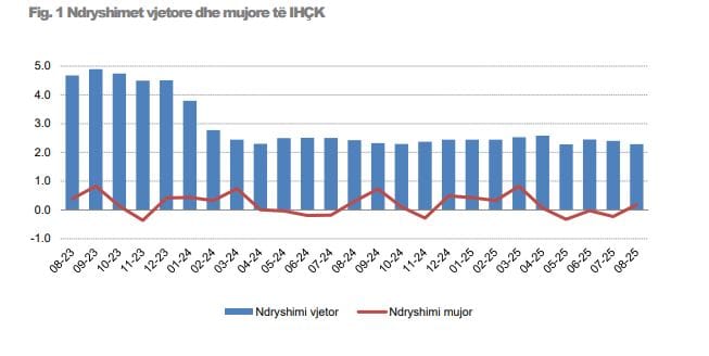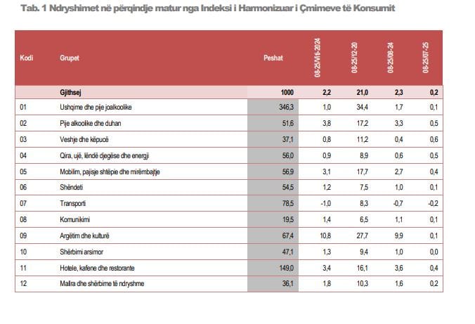 Në muajin Gusht 2025, ndryshimi mujor i matur nga Indeksi i Harmonizuar i Çmimeve të Konsumit është +0,2 %. Ky ndryshim është ndikuar kryesisht nga rritja e çmimeve të grupit “Veshje dhe këpucë” me 0,6 %, pasuar nga grupet “Pije alkoolike dhe duhan” dhe “Qira, ujë, lëndë djegëse dhe energji” me 0,5 % secili, “Mobilim, pajisje shtëpie dhe mirëmbajtje” dhe “Hotele, kafene dhe restorante” me 0,4 % secili, “Mallra dhe shërbime të ndryshme” me 0,2 %, “Ushqime dhe pije joalkoolike”, “Shëndeti”, “Komunikimi” dhe “Argëtim dhe kulturë” me 0,1 % secili. Nga ana tjetër, çmimet e grupit “Transporti” u ulën me 0,2 %.