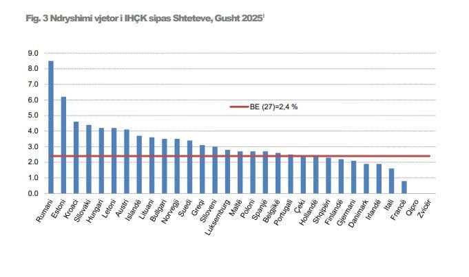 Çmimet e konsumit vijojnë të shfaqin dallime të mëdha mes vendeve të Bashkimit Europian. Sipas të dhënave të fundit për gushtin 2025, Rumania kryeson listën me një normë vjetore inflacioni prej mbi 8%, e ndjekur nga Estonia dhe Kroacia me nivele mbi 5–6%. Edhe Sllovakia, Hungaria dhe Letonia regjistrojnë rritje të ndjeshme të indeksit të çmimeve të konsumit, që variojnë nga 4 deri në 5%.