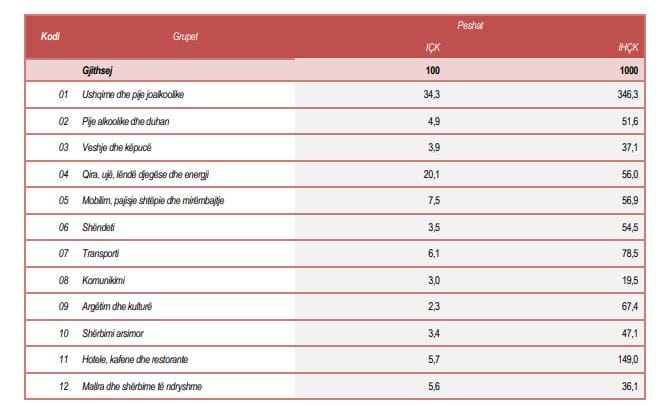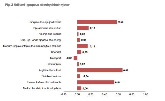 Rritja më e madhe e çmimeve prej 9,9 % vërehet në grupin “Argëtim dhe kulturë”, pasuar nga grupet “Hotele, kafene dhe restorante” me 3,6 %, “Pije alkoolike dhe duhan” me 3,3 %, “Mobilim, pajisje shtëpie dhe mirëmbajtje” me 2,7 %. Grupi “Ushqime dhe pije joalkoolike” u rrit me 1,7 %, “Mallra dhe shërbime të ndryshme” me 1,6 %, “Komunikimi” me 1,1 %, “Shëndeti” dhe “Shërbimi arsimor” me 1,0 % secili, “Qira, ujë, lëndë djegëse dhe energji” me 0,6 %, “Veshje dhe këpucë” me 0,4 %. Nga ana tjetër, çmimet e grupit “Transporti” u ulën me 0,7 %.