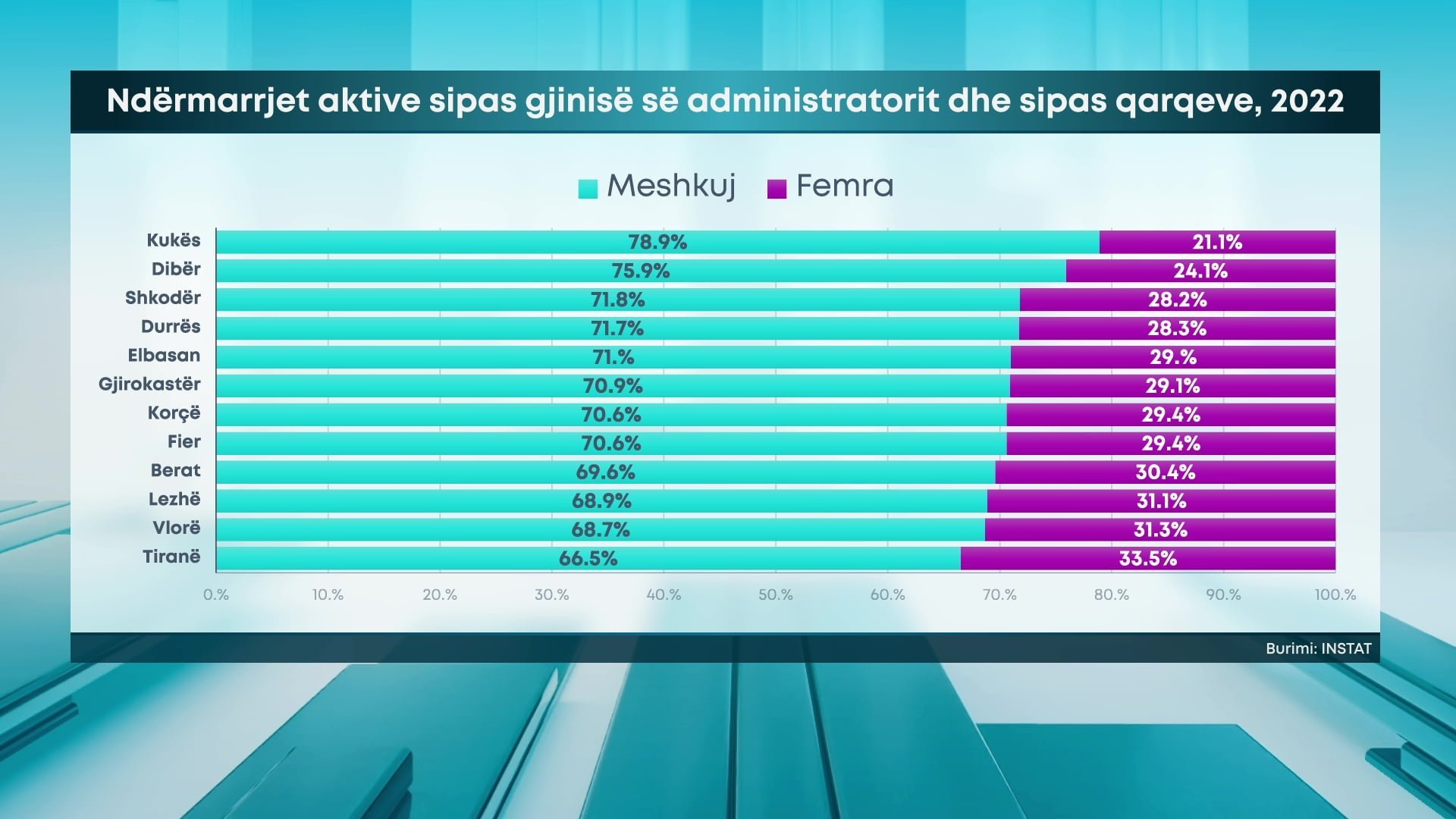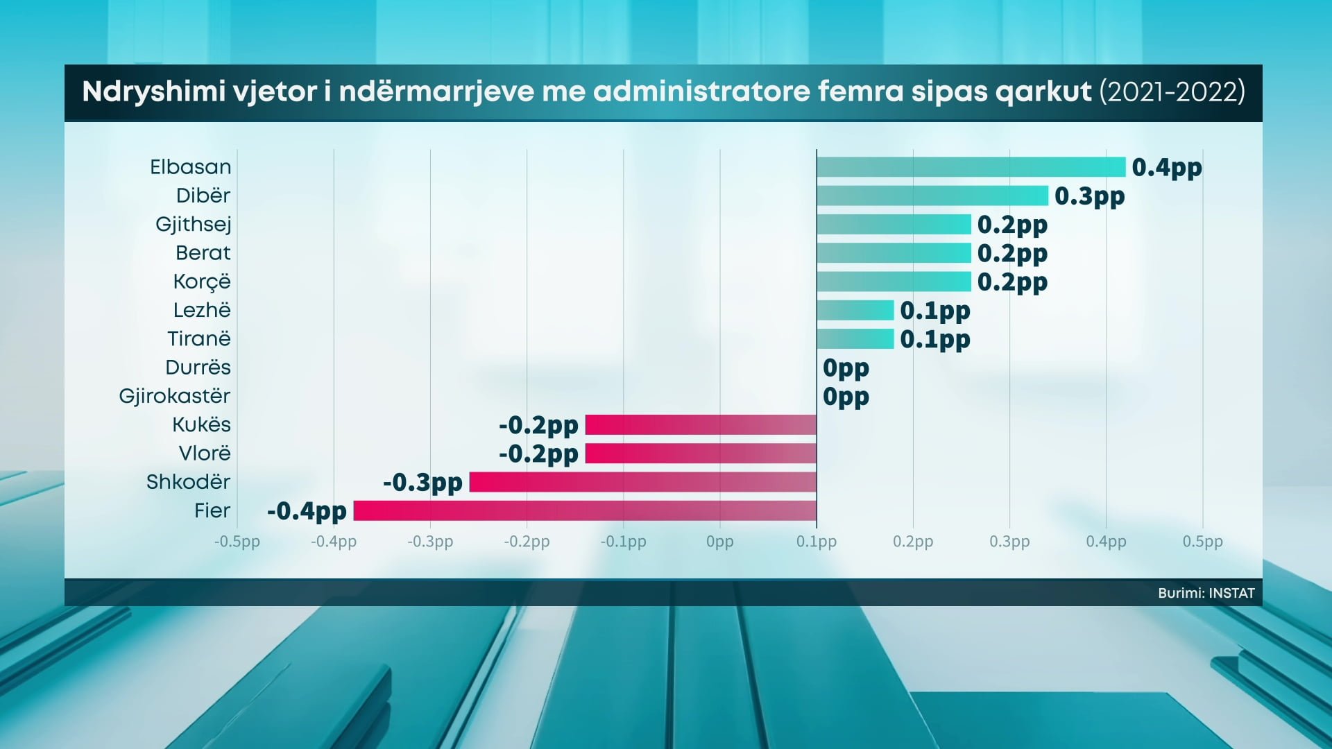 Ndërkohë, nga ana tjetër, vërehet një rënie e numrit të ndërmarrjeve të cilat administrohen nga femrat në qarqe si Fieri me 0.4 pikë përqindje, në Shkodër me 0.3 pikë dhe në Kukës me 0.2 pikë pëqindje. Sipas të dhënave të INSTAT, në vitin 2022 ka patur më shumë pronare femra në Elbasan, Dibër dhe Korçë me një rritje 0.4 pikë, 0.3 pikë dhe 0.2 pikë secila.