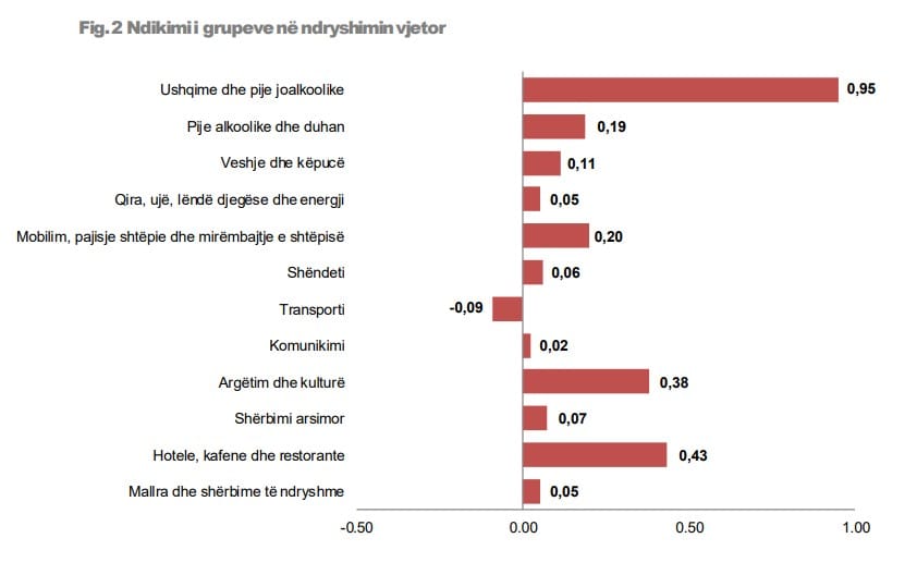 Ky ndryshim është ndikuar kryesisht nga rritja e çmimeve të grupit “Ushqime dhe pije joalkoolike” me 1,1%, pasuar nga grupet “Mobilim, pajisje shtëpie dhe mirëmbajtje” me 0,5%, “Argëtim dhe kulturë” me 0,4%, “Shëndeti” dhe “Transporti” me 0,1% secili. Nga ana tjetër, çmimet e grupit “Veshje dhe këpucë” u ulën me 0,4%, pasuar nga grupi “Mallra dhe shërbime të ndryshme” 0,1%.
