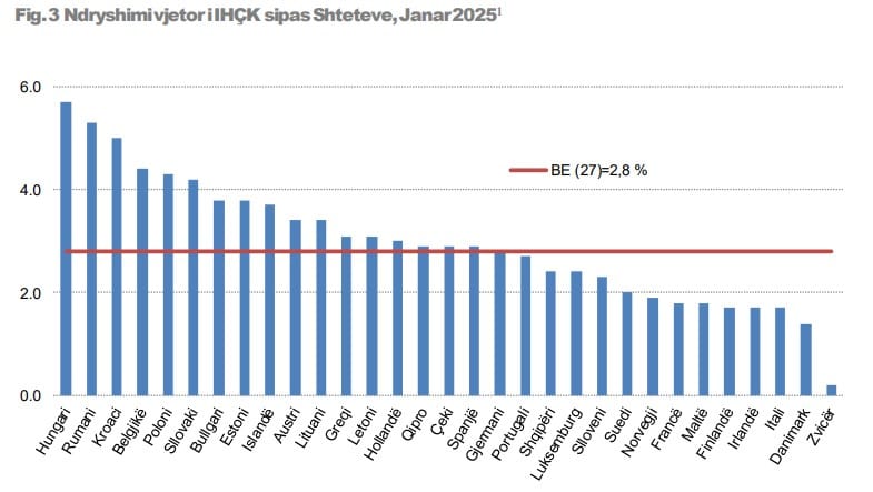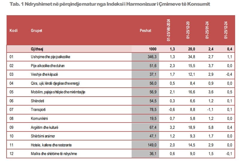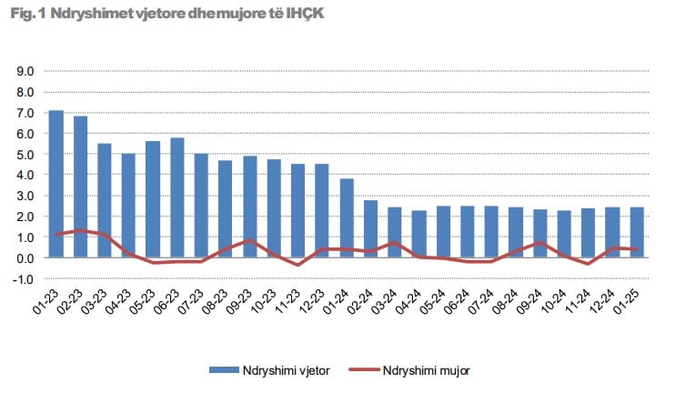 Sipas të dhënave nga Indeksi i Harmonizuar i Çmimeve të Konsumit (EUROSTAT), në muajin Janar 2025 është 2,4%, ndërsa sipas matjeve të brendshme (INSTAT) inflacioni i janarit ishte 1.9%.