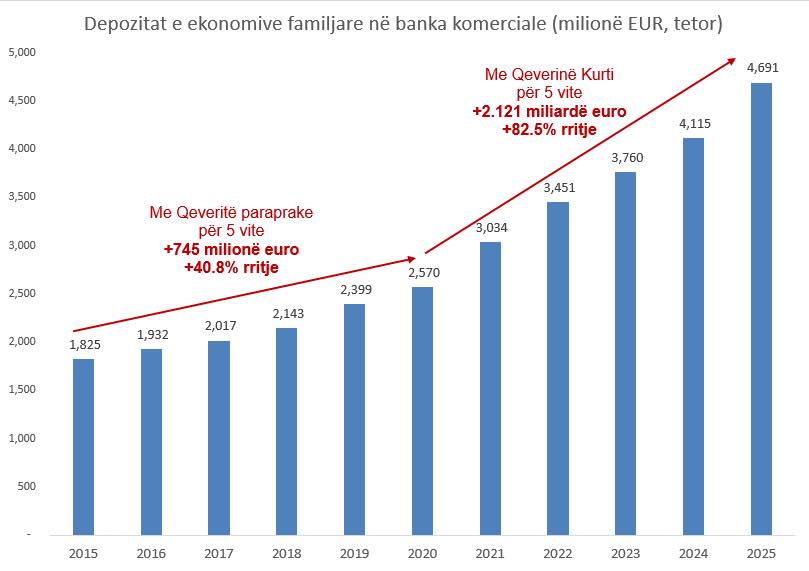 Sa për krahasim, në periudhën 5 vjeçare para Qeverisë Kurti, depozitat dhe kurismet e familjeve kishin shënuar rritje prej vetëm 745 milionë eurove, apo 40.8%. Pra në periudhën 2020-2025, rritja e parave në banka (depozita/kursime) për familjet në Kosovë ka qenë më se 2-fish më e shpejtë sesa rritja e parave në banka përgjatë 5-vjeçarit të qeverisjeve të kaluara (82.5% vs 40.8%).”