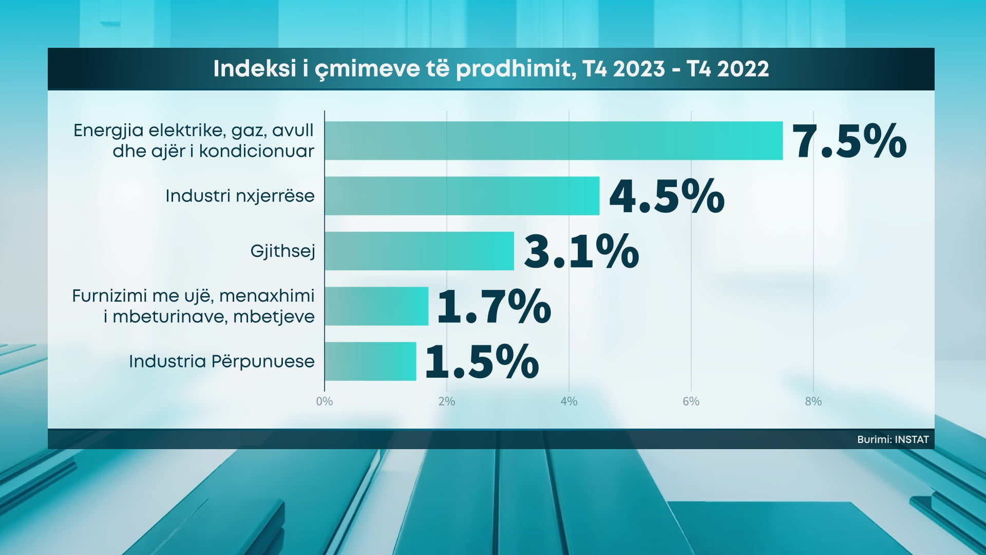 Nëse analizojmë kontribuesit e rritjes së këtij treguesi sipas zërave vëmë re se krahasuar me një vit më parë, rritja më e madhe e çmimeve prej 7.5% vërehet në seksionin “Energjia elektrike, gaz, avull dhe me ajër të kondicionuar”, pasuar nga seksionet, “Industri nxjerrëse”, me 4.5%, “Furnizimi me ujë, aktivitete të trajtimit dhe menaxhimit të mbeturinave, mbetjeve” me 1.7% dhe “Industri përpunuese” me 1.5%.