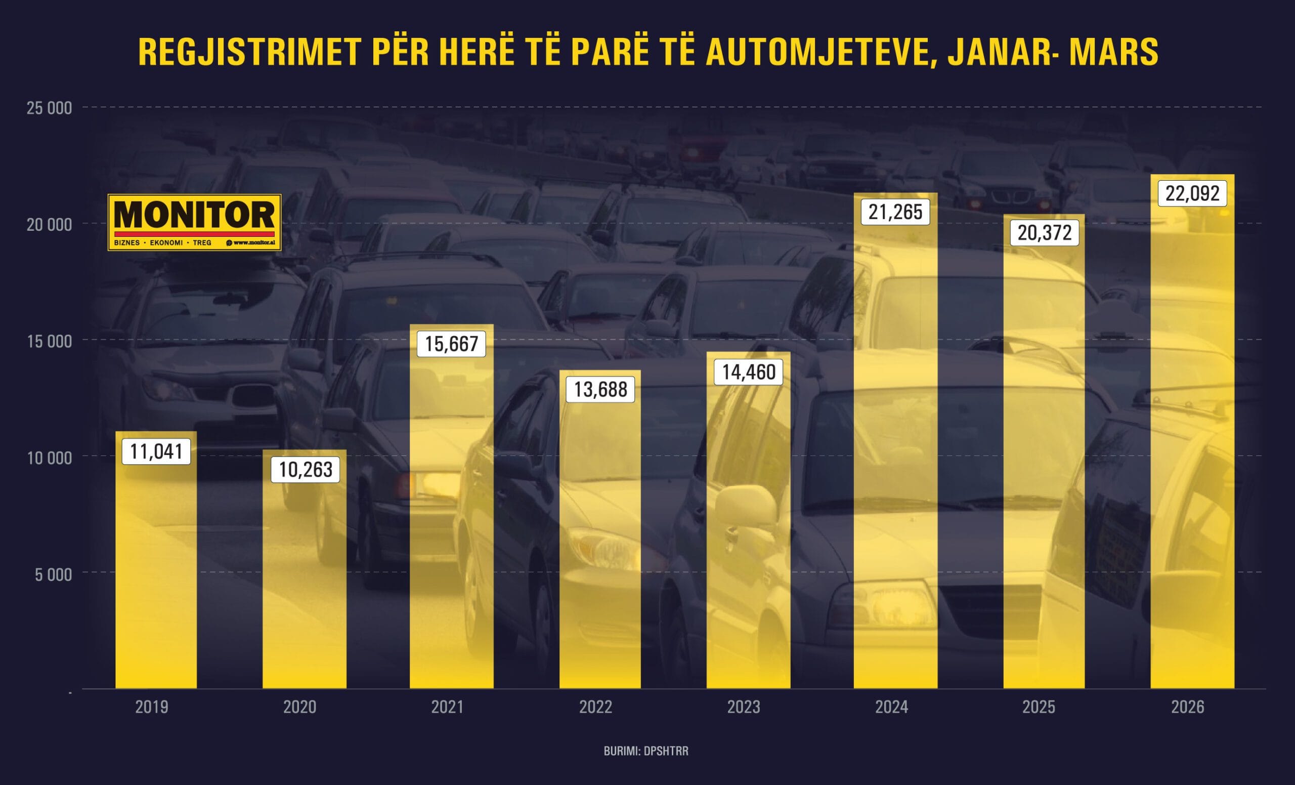 Sipas të dhënave nga Drejtoria e Përgjithshme e Shërbimeve të Transportit Rrugor (DPSHTRR), në mars u regjistruar për herë të parë 7,891 automjete në vend, me një rritje prej 15% në krahasim me të njëjtin muaj të një viti më parë. Ky është dhe rekordi historik i regjistrimeve të reja të automjeteve që është shënuar ndonjëherë në mars.