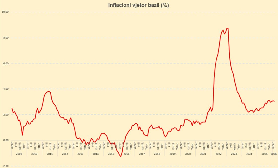 Sipas informacionit të Bankës së Shqipërisë, inflacioni vjetor bazë për muajin shkurt ra shumë lehtë në 3.06%, nga 3.09% që kishte qenë në janar dhe 2.33% që kishte qenë në shkurt 2025. Inflacioni bazë po konfirmohet pranë niveleve më të larta të dy viteve të fundit, duke reflektuar një tendencë të rritjes së çmimeve të mallrave të qëndrueshëm dhe sidomos të shërbimeve të prodhuara nga ekonomia e brendshme.