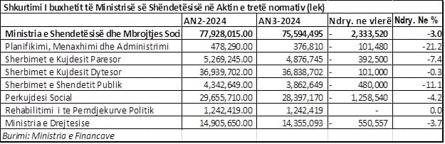 Ecuri të ngjashme kane edhe shpenzimet për shëndetësinë. Në vitin 2024 shpenzimet për shëndetësinë janë programuar sipas ndryshimeve të fundit 75,9 miliardë lekë nga 77,9 miliardë lekë në aktin e dytë normativ.