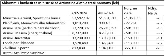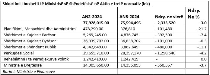 Sipas tabelave të mëposhtme buxheti i Ministrisë së Shëndetësie u shkurtua me 2.3 miliardë lekë ose me 3%, ndërsa buxheti i Ministrisë së Arsimit u shkurtua me 1 miliardë lekë ose 2 për qind e programit total.