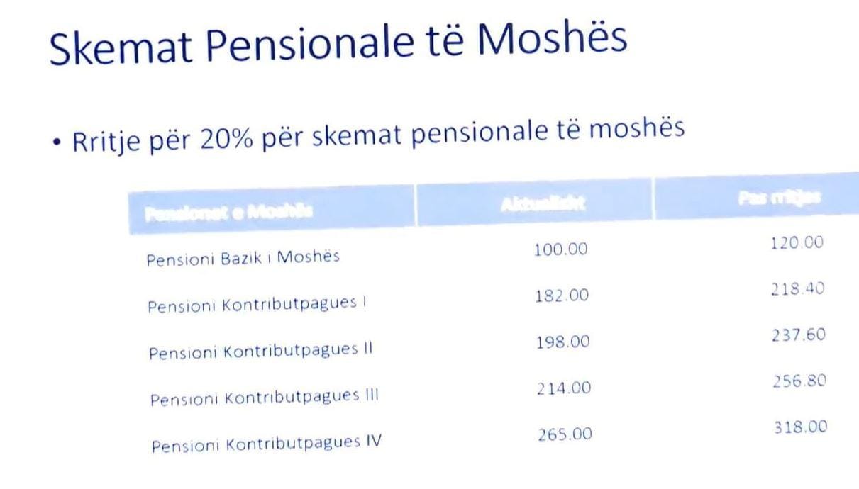 Sipas të dhënave të prezantuara në konferencë, pensioni bazik i moshës do të rritet nga 100 në 120 euro.