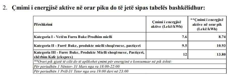 Pika 2 e vendimit, tashmë që ka hyrë në fuqi parashikon se çmimi i energjisë aktive në orar piku do të jetë, si: Kategoria I – Vetëm Furra Buke/Prodhim mielli që paguajnë 7.6 lekë/kWh në orarin e pikut çmimi i energjisë do të jetë 8.74 lekë/kWh.
