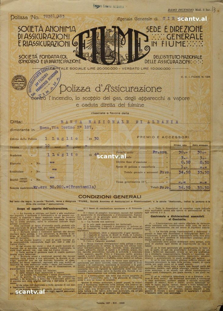 Një rol të rëndësishënm në tregun shqiptar të sigurimeve ka luajtur edhe kompania Fiume. Kjo kompani hapi degë në të gjitha prefekturat dhe nënprefekturat e Shqipërisë. Qendra e kësaj kompanie ishte në Fiume, sot Rijeka e Kroacisë, dhe ishte e lidhur me Institutin Kombëtar të Sigurimeve në Itali.