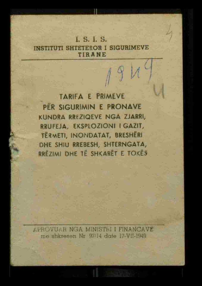 Sigurimi i pronave ndahej në 3 kategori dhe me dy tarifa. Tarifa A përdorej për ndërtesat, mobiljet, sendet shtëpiake ndërsa Tarifa B përdorej për mallrat dhe dyqanet ku ishin vendosur punëtoritë e artizanatit. Për efekt sigurimi i gjithë territori i Shqipërisë ndahej në dy zona; Zona 1 dhe Zona 2.