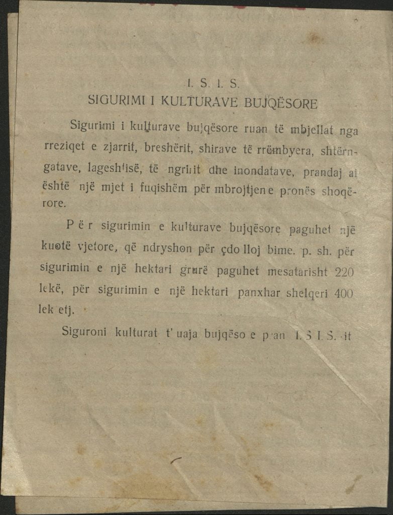 Një nga produktet e sigurimit të periudhës së ekonomisë së centralizuar ishte edhe sigurimi i prodhimeve bujqësore. Sigurimi i kulturave bujqësore mbulonte të mbjellat nga rreziqet e zjarrit, breshërit, shirave të rrëmbyeshëm, shtrëngatave, ngricave apo përmbytjeve. Për sigurimin e kulturave bujqësore paguhej një kuotë vjetore që ndryshonte për çdo lloj bime. P.sh për sigurimin e një hektari grurë paguhej mesatarisht 220 lekë ndërsa për sigurimin e një hektari panxhar sheqeri, 400 lekë etj.