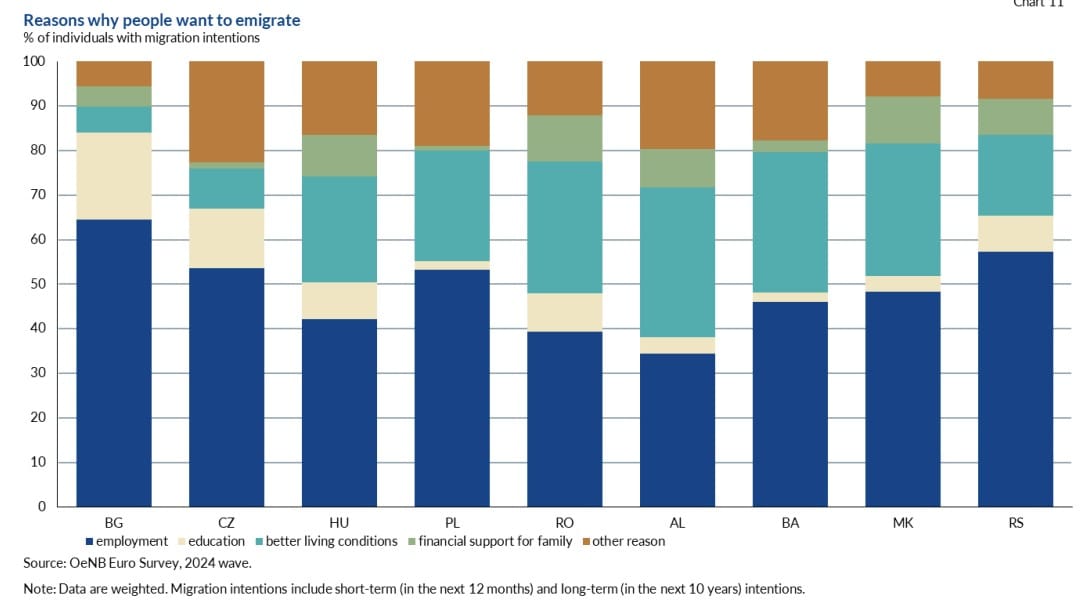 Sa i përket arsyeve për emigrim të paraqitura në grafikun 11, shumica e njerëzve deklarojnë se duan të emigrojnë për arsye të lidhura me punësimin (46%). Kjo pasohet nga kushtet më të mira të jetesës jashtë vendit si arsyeja e dytë kryesore (26%). Kështu, përmirësimet në kushtet e tregut të punës dhe në shërbimet publike, si arsimi ose kujdesi shëndetësor, mund të jenë kyçe për të reduktuar më tej synimet për migrim në vendet e CESEE ose për të nxitur kthimin e njerëzve.