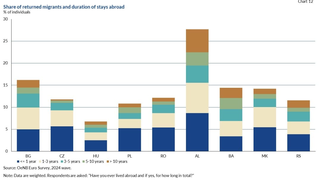Në vitin 2024, të anketuarve iu kërkua të tregonin nëse kishin jetuar më parë jashtë vendit. Grafiku 12 tregon se pjesa e këtyre të kthyerve është e konsiderueshme në vendet e CESEE, duke arritur mesatarisht 14%. Hungaria ka pjesën më të ulët me diferencë, me rreth 7% të popullsisë që ka jetuar jashtë.