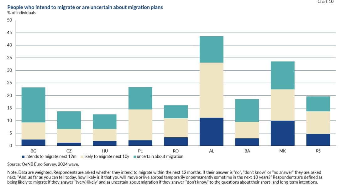 Në vitin 2024, 10% e shqiptarëve dhe 11% e qytetarëve të Maqedonisë së Veriut shprehnin synim për t’u larguar brenda një viti, nivelet më të larta në rajon. Vendet e tjera si Serbia, Rumania, Bosnja dhe Hercegovina, Bullgaria dhe Polonia shënojnë shifra më të ulëta, nga 2% deri në 5%, ndërsa Hungaria dhe Çekia raportojnë më pak se 2%.