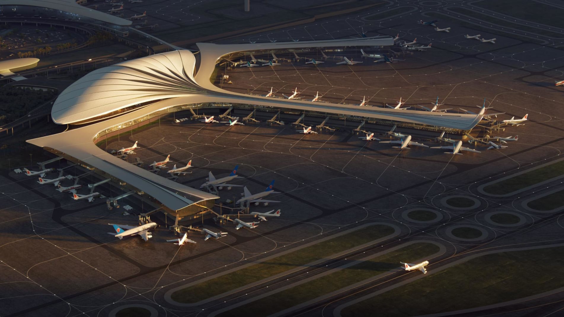 Renderimet dixhitale të lëshuara nga MAD Architects tregojnë ndërtesën e terminalit Changchun të veshur në të bardhë, me të çara përgjatë harqeve të saj të buta që lejojnë dritën natyrale të hyjë ndërsa lëshon shkëlqimin e dritës artificiale, duke prodhuar një efekt elegant të artë. Terminali ankoron atë që firma e përshkruan si një “strukturë korridori me tre gishta”, me avionë të fotografuar të parkuar mjeshtërisht rreth 54 portave të tij.