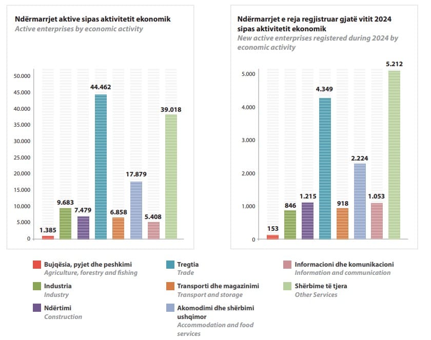 Të dhënat e Regjistrave të Biznesit 2024 konfirmojnë se ekonomia shqiptare po zgjeron gradualisht bazën e saj, por ende mbetet e fragmentuar mes shumë njësi mikro. Ndërkohë që sektori i shërbimeve vazhdon të udhëheqë rritjen.