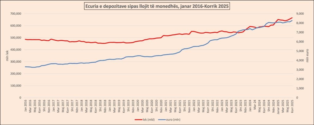 Me bazë vjetore (korrik 2025/korrik 2024), depozitat në monedhën e përbashkët janë rritur me 8.3%, ose 635 milionë euro më shumë.