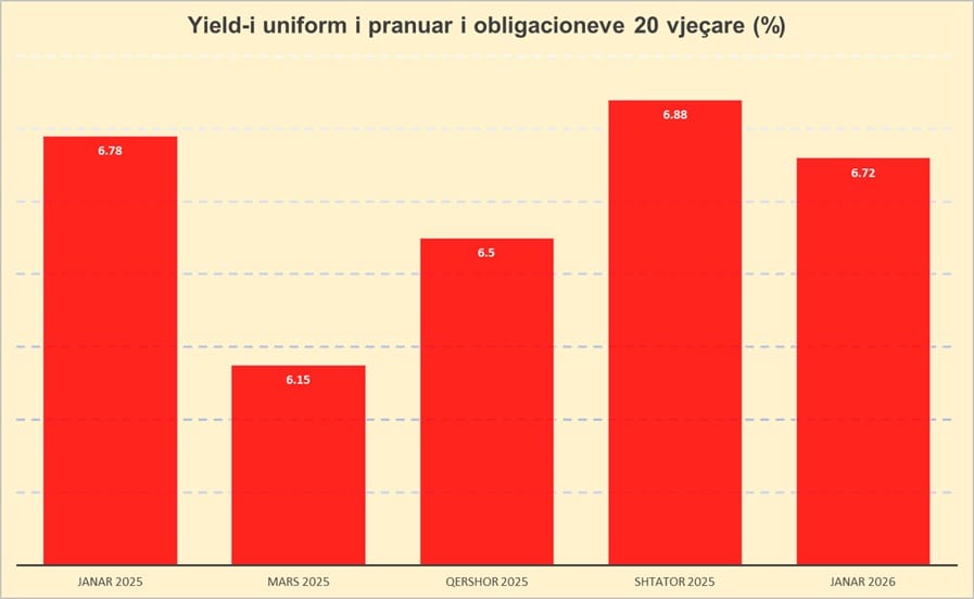 Yield-et e obligacioneve afatgjata e kanë nisur me rënie vitin 2026. Sipas informacionit të Bankës së Shqipërisë, në ankandin e obligacioneve 20-vjeçare të zhvilluar të martën, yield-i uniform i pranuar dhe kuponi ranë në 6.72%, nga 6.88% që kishte qenë yield-i në ankandin e fundit të këtyre instrumenteve, të zhvilluar në shtator të vitit të kaluar.