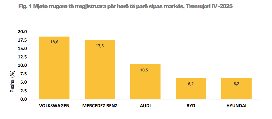 Sipas INSTAT, Në mjetet e regjistruara për herë të parë, Volkswagen mban vendin e parë me 18,6 %, e ndjekur nga Mercedes Benz me 17,5%.