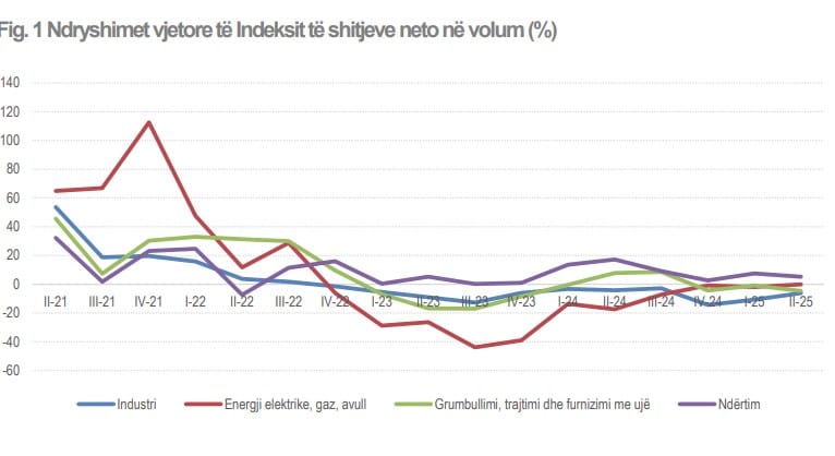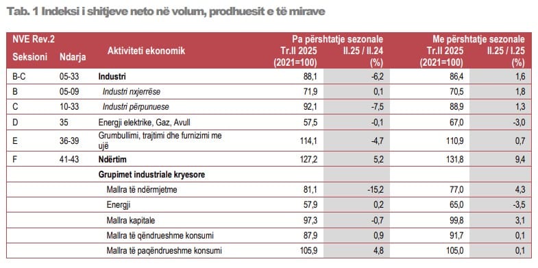 Treguesit tremujorë për prodhuesit e të mirave në vend, të publikuar për periudhën prill–qershor 2025, tregojnë kontraste mes sektorëve prodhues, ku industria vijoi rënien, ndërsa ndërtimi rritjen.