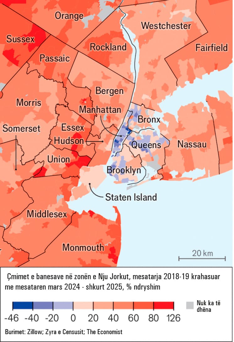 Çmimet e shtëpive në qendër të 20 qyteteve më të mëdha të Amerikës janë rritur me 13% mesatarisht që nga viti 2019, shumë më pak se rritja prej 30-50% në periferi ose më larg (shih hartën).