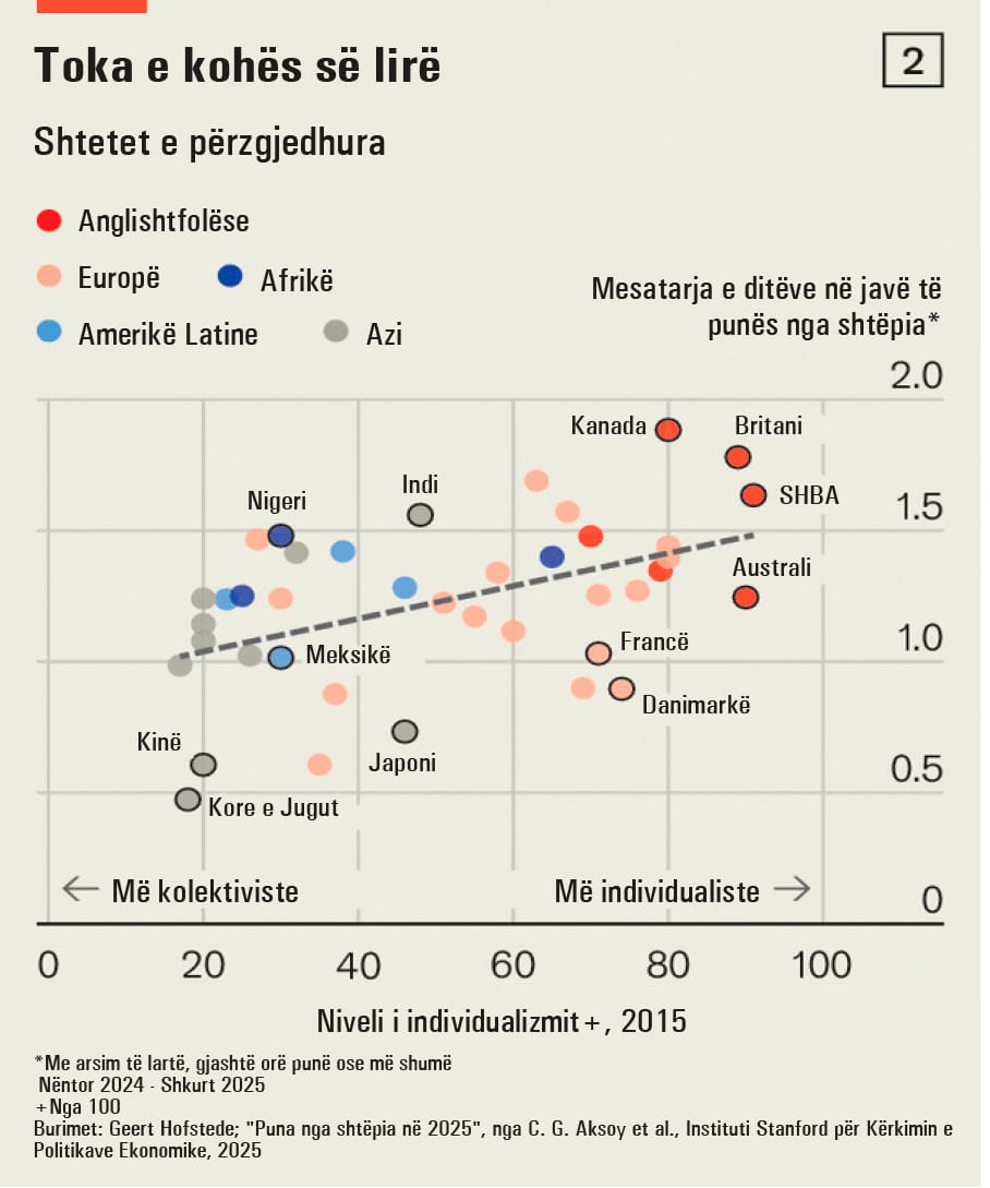 Zoti Bloom dhe bashkautorët e tij kanë zbuluar se sa më individualiste të jetë një shoqëri, aq më tepër ajo e përqafon punën në distancë, dhe sa më kolektiviste, aq më pak e do këtë stil pune (shih grafikun 2).