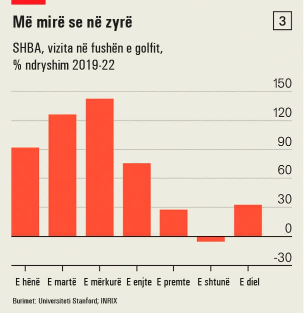 Gjatë viteve të fundit, ka lulëzuar veprimtaria e golfit në mes të javës, sipas studimit të zotit Bloom dhe Alex Finan, nga Universiteti Stanford (shih grafikun 3).