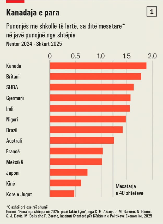 Një kanadez me shkollë të lartë punon nga shtëpia mesatarisht 1,9 ditë në javë. Shifra është e ngjashme për britanikët, 1.8, dhe disi më e ulët për amerikanët, 1.6.